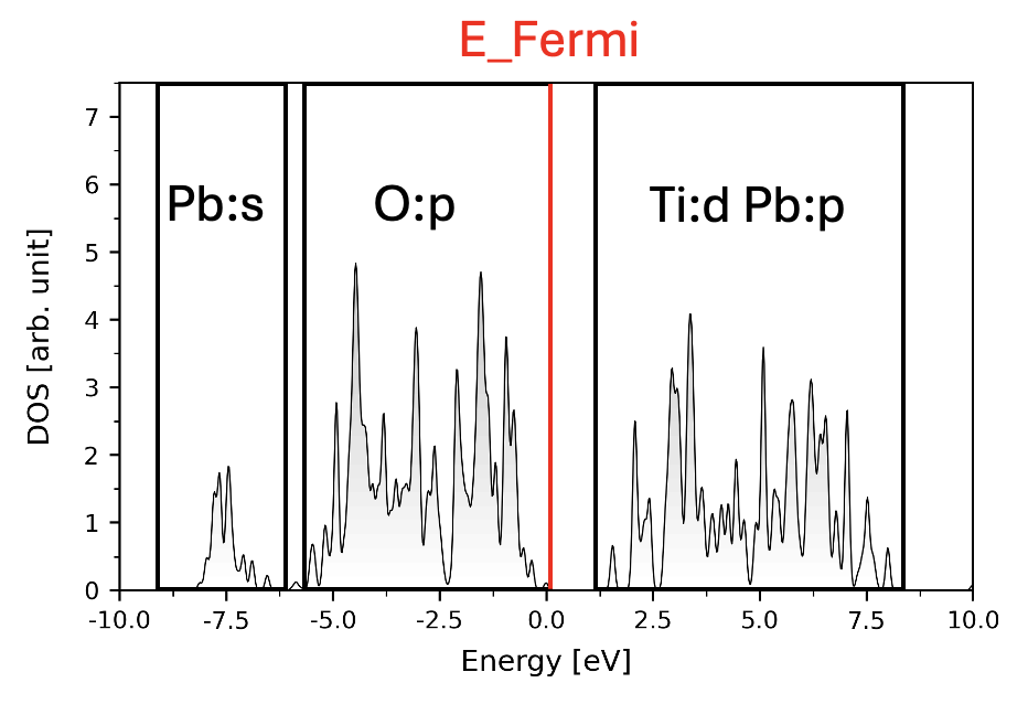 In this case, for MO, all Bloch bands between -10 and 0eV are used and projection are made onto Pb’s s-orbital and O’s p-orbitals. For AO, all Bloch bands between -10 and 9eV are used and projection are made onto Pb’s s-orbital, O’s p-orbitals, Ti’s d-orbitals and Pb’s p-orbitals.